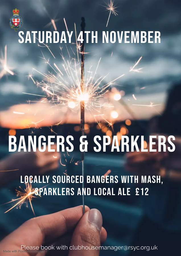 Locally sourced bangers with mash, sparklers and local Ale. £12 per person Please book with clubhousemanager@rsyc.org.uk |
